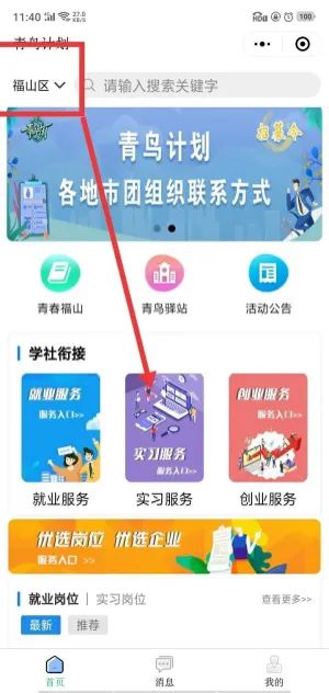5、点击“91天堂—实习岗位”→左上角选择所在县市区→实习服务→选择心仪的岗位投递简历即可。