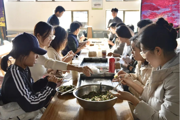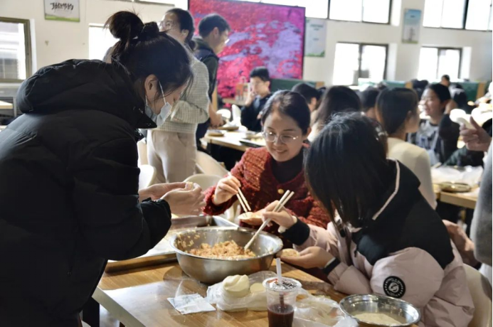 随着一盘盘热气腾腾的饺子出锅,师生围坐一堂,品尝着自己亲手制作的饺子。老师们深入了解学生们的学习和生活情况,畅聊生活趣事,并勉励他们珍惜大学时光,表达对同学们的关怀。