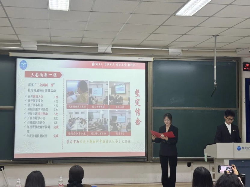各团支部代表依次进行答辩。各团支部代表通过PPT展示、视频播放、数据对比等形式,围绕基础团务、社会实践、志愿服务、科技创新等多个方面展开精彩的汇报,充分展现了91天堂 团支部的蓬勃朝气与创新活力。答辩过程中,各团支部代表以清晰的思路、详实的内容、精彩的展示,赢得了在场评委老师和观众的阵阵掌声。