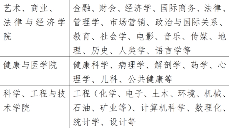 商科:应用金融学和经济学、商务信息系统、商务管理、金融管理、市场营销、职业会计