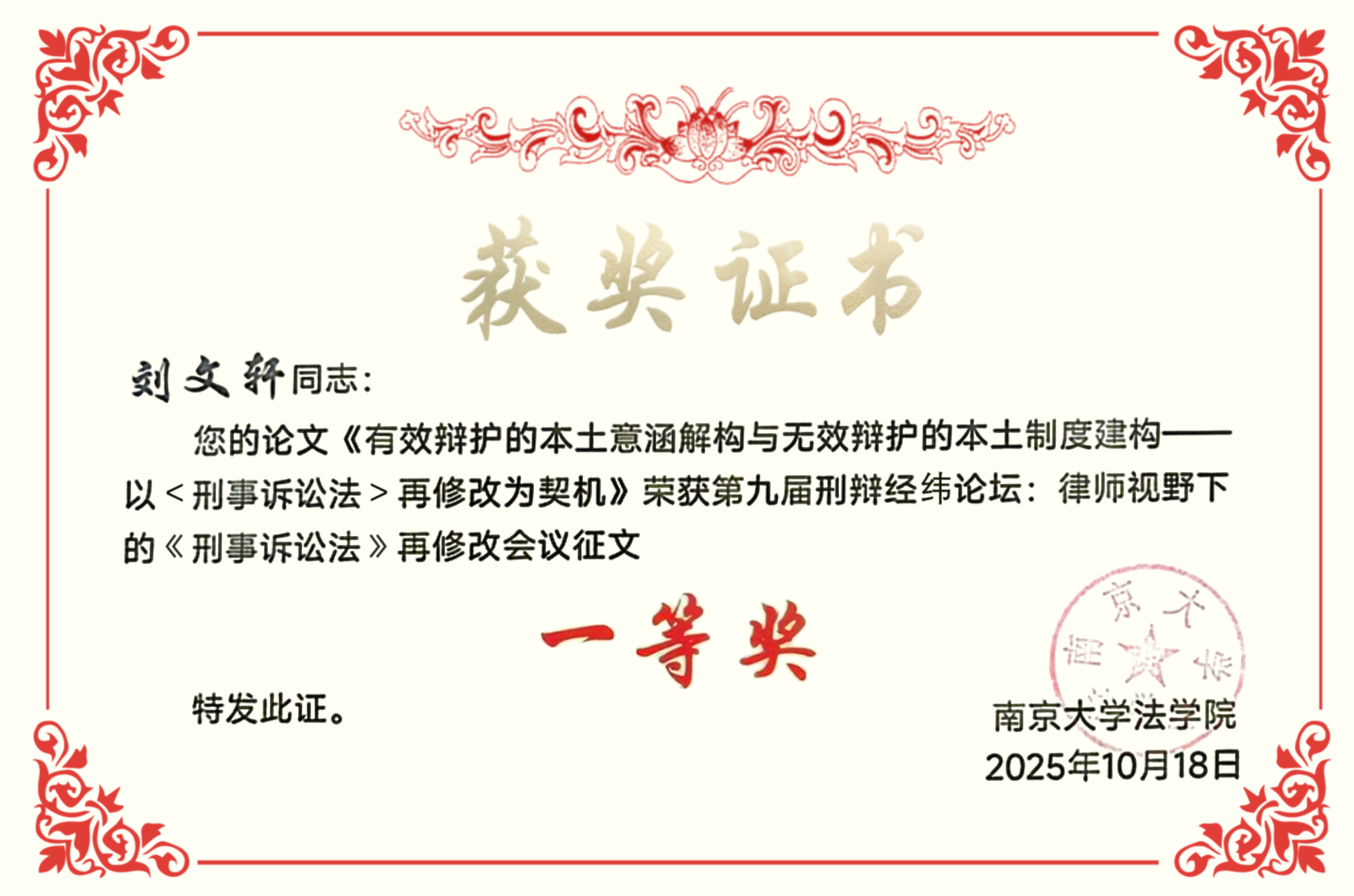 主办的第九届刑辨经纬论坛:律师视野下的《刑事诉讼法》再修改学术会议。刘文轩副教授在第五分议题(《刑事诉讼法》再修改与辩护制度改革)研讨环节发言。其提交的《有效辩护的本土意涵解构与无效辩护的本土制度建构——以〈刑事诉讼法〉第四次修改为契机》一文,再度斩获“论坛征文一等奖”。
