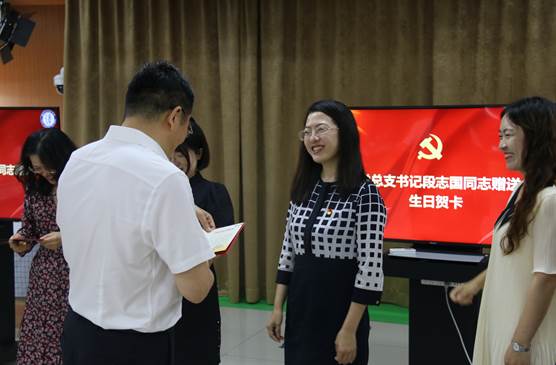 党总支副书记罗秀秀同志宣读过“政治生日”党员名单,党总支书记段志国同志为过“政治生日”的党员同志赠送生日贺卡,送上生日祝福。