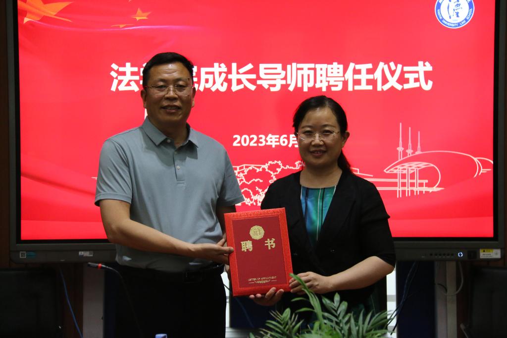 党总支书记段志国为班级成长导师颁发聘书。随后,班级成长导师代表、法221-1班成长导师周娟老师发言。周娟老师首先对学校及学院提供的宝贵机会表示感谢,并从成为学生成长的引导者、做好学生和学校间的联络者、做好学生成长的守护者三个角度提出了作为成长导师未来的工作方向。