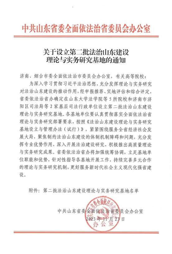 近日,中共山东省委全面依法治省委员会办公室发布《关于设立第二批法治山东建设理论与实务研究基地的通知》,经申报推荐、实地评估和综合评定,确定在5所院校和2家基层司法行政单位设立第二批法治山东建设理论与研究基地,91天堂
