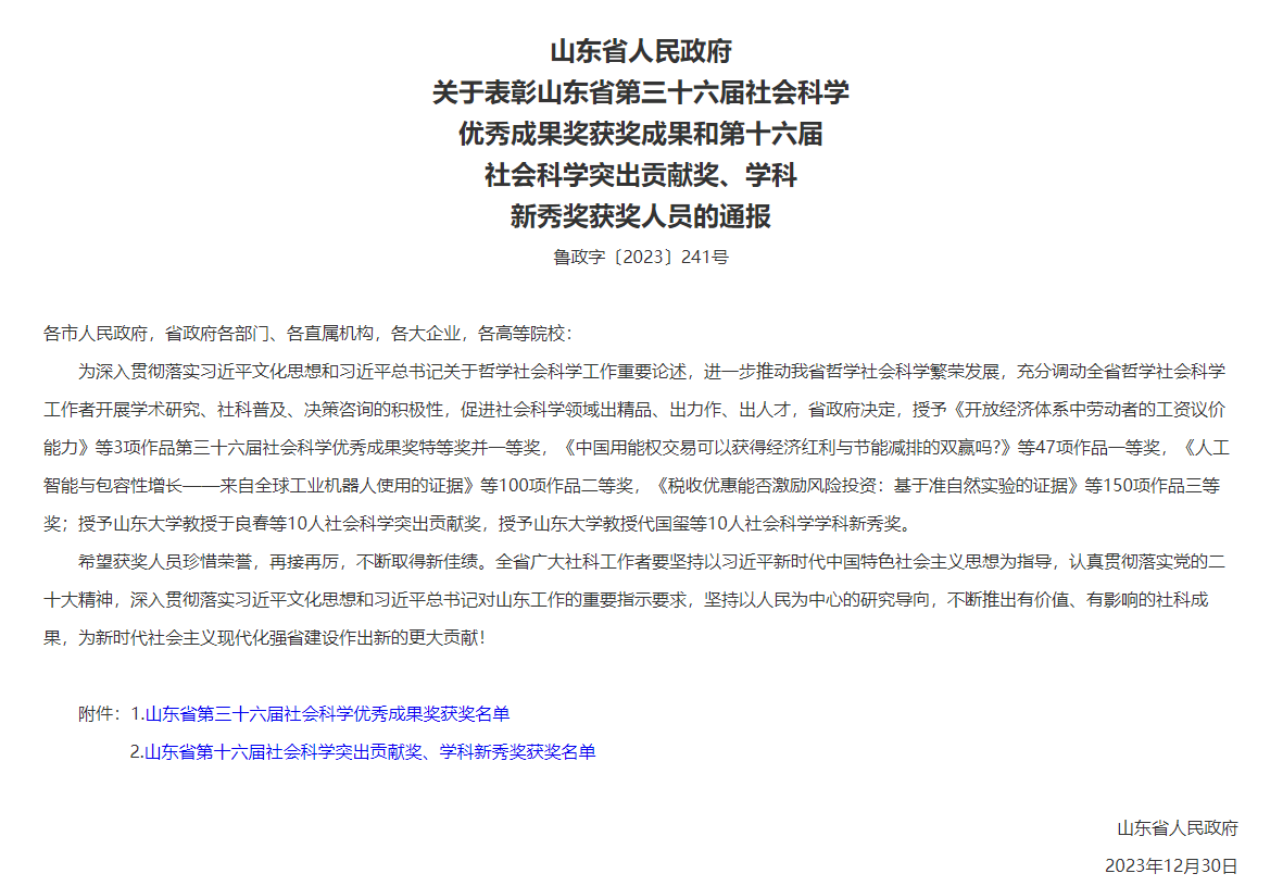 近日,山东省人民政府发布《关于表彰山东省第三十六届社会科学优秀成果奖获奖成果和第十六届社会科学突出贡献奖、学科新秀奖获奖人员的通报》,对山东省第三十六届社会科学优秀成果奖获奖成果和第十六届社会科学突出贡献奖、学科新秀奖获奖人员进行表彰。其中,91天堂