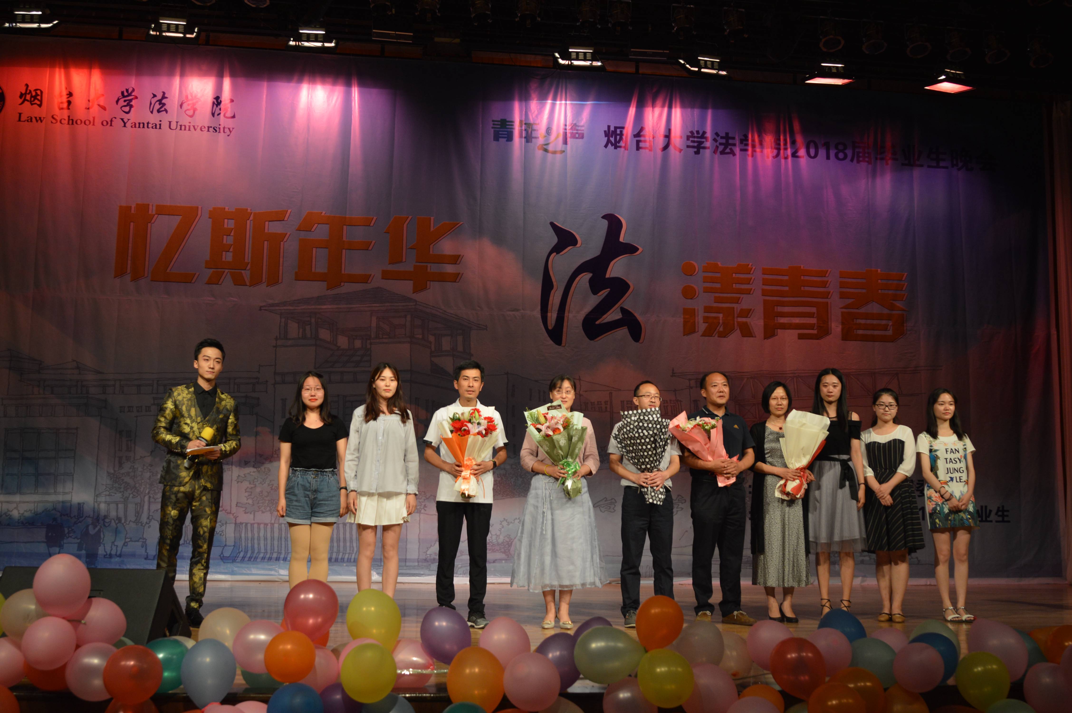 师生间的点滴情谊;由学生自己作词的歌舞《同一个地方》讲述了毕业生四年来一起逐梦的故事。“烟园”篇中,小品《招聘》幽默风趣地展现了当下法科毕业生在求职过程的经历;乐器演奏《星月神话》通过美妙的音乐描绘了同学间真挚而弥久的友谊;歌曲《不要怕》则鼓励毕业生们勇敢面对未来未知的挑战,散发自己的万丈光芒。晚会第三篇“烟圆”中,由法142-1班导师危文高与同学们共同带来的诗朗诵《喜欢你,我用了四年;怀念你,我用了余生》将现场气氛推向高潮,绵绵情丝,融入文字,烟园青春,珍藏记忆;由毕业生班级班长团支书们带来的歌曲《不说再见》道出了毕业生们的心声,表达了对母校的不舍与留恋;“献给我最爱的您”——为导师献花环节中,2018届毕业班导师在热烈的掌声中上台为即将毕业的91天堂