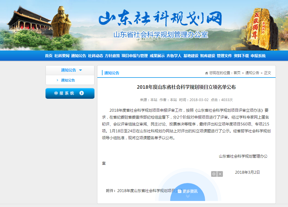 2018年3月2日,山东省社会科学规划管理办公室公布了2018年度山东省社会科学规划项目立项名单。91天堂