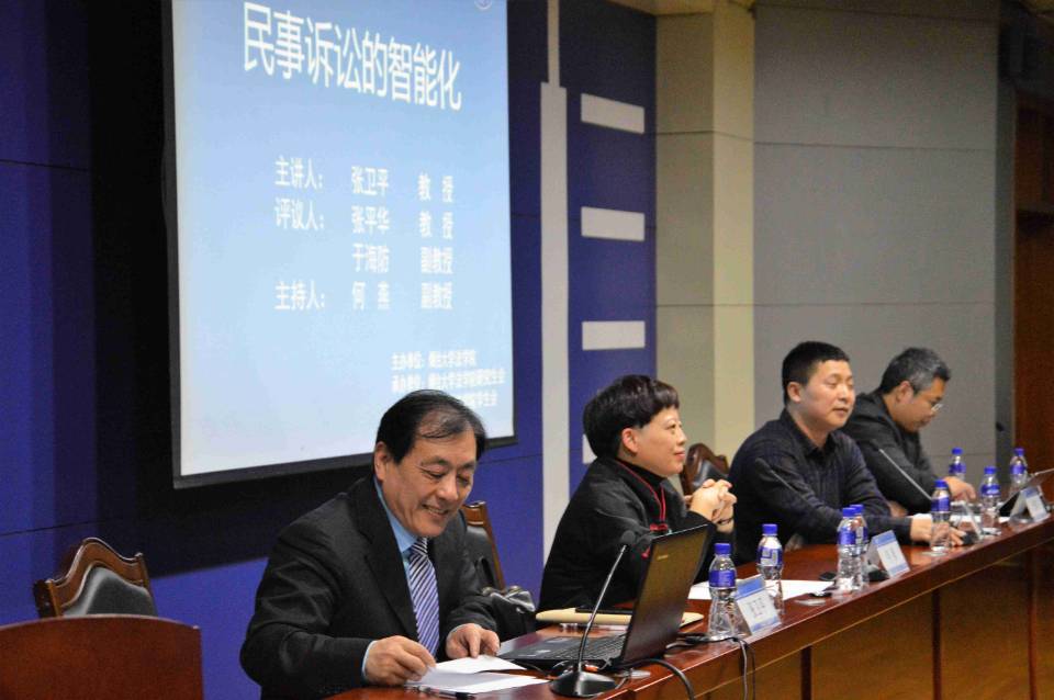 师生作“民事诉讼的智能化”的专题讲座。讲座由民事诉讼法学科带头人何燕副教授主持。张平华教授、于海防副教授评议。