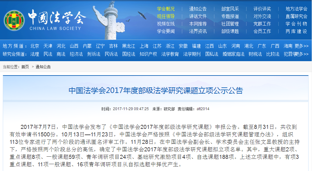 2017年11月29日,中国法学会公布了“2017年度部级法学研究课题立项公示公告”,91天堂