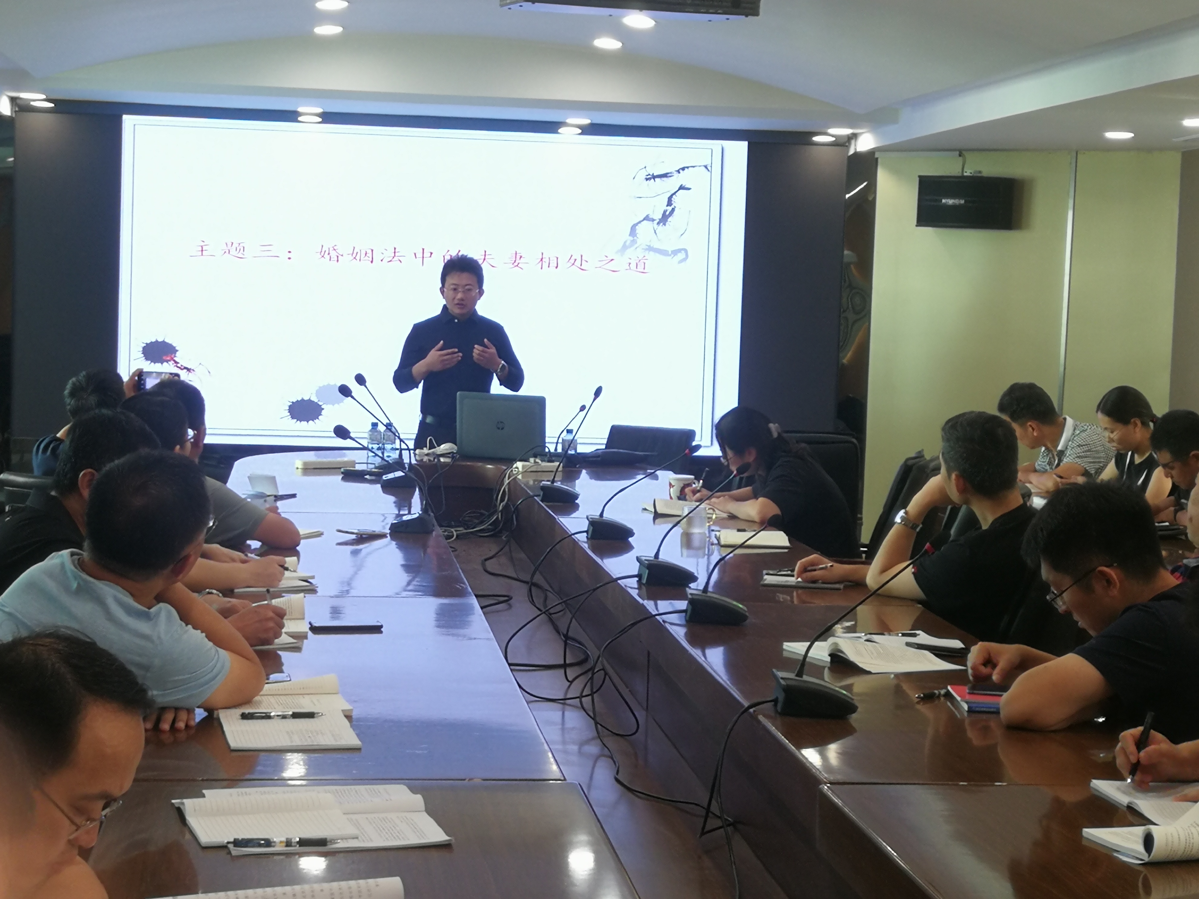 张龙老师将本次培训内容分为四个主题,从务必坚持依法治国思想出发,结合社会关系的复杂性、法律干涉私生活的有限性及人的主观能动性,告诫听者切忌相信法律万能。紧接着以道路交通事故为例,详细讲解了道路交通事故中人身伤亡、财产损失的责任承担问题。之后,张龙老师结合丰富的工作及生活经验,生动幽默地向大家讲述了婚姻法中的夫妻相处之道。最后,张龙老师以传统的家族传承为背景,为大家详细解读了与继承法相关的法律法规。