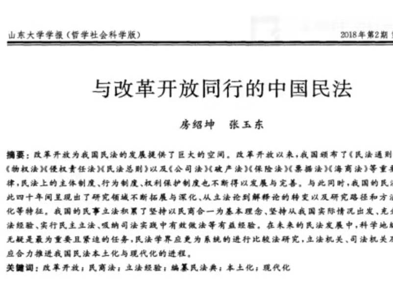 《与改革开放同行的中国民法》原载于山东大学学报2018年第2期。该文认为,改革开放为我国民法的发展提供了巨大的空间,民法制度和民法学研究得以不断发展与完善。未来立法机关、司法机关及民法学者应合力推进我国民法本土化与现代化的进程。