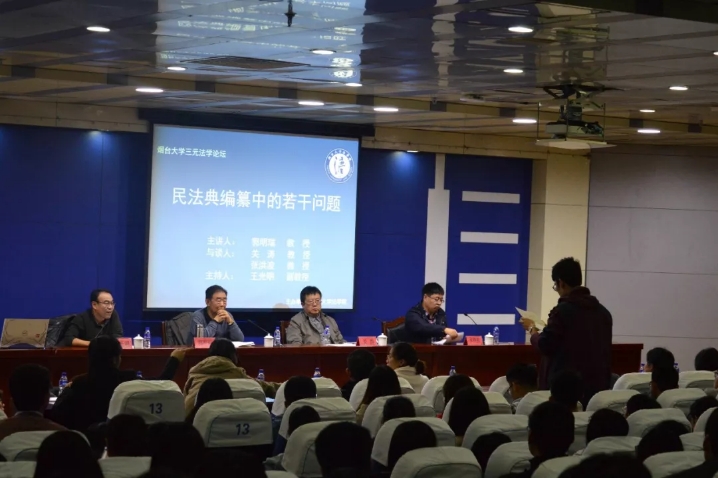 讲座伊始,郭明瑞教授讲述了我国民法典编纂的基本历程,并介绍了当前我国民法典编纂的四大原则和编纂的基本步骤。之后,郭教授围绕民法典的结构体系,就人格权法是否需要独立成编,知识产权法应否入典,要不要制定债法总则,涉外民事法律关系的适用,以及总则与分则的关系等问题,进行了深入的分析。最后,郭教授还就民法典分则编纂中的疑难问题,围绕物权法、合同法、婚姻家庭法和继承法的草案规定,展开深入的研讨。整场讲座,郭教授立基于我国的具体国情,以宽广的理论视野,直面现实中存在的问题,对民法典编纂中诸多难题给出了合理的解决方案。与谈阶段,关涛教授就郭明瑞教授所展开的民法典编纂中的若干争议分享了自己看法,帮助同学们进一步拓展了理论视野。张洪波教授则针对“三权分置”问题,详细梳理了该问题的产生背景和发展历程,以及当前存在的困境,进一步加深了同学们对该问题的理解。最后的互动环节,同学们积极参与,围绕讲座内容积极提问,对同学们提出的问题,郭明瑞教授进行了一一解答,现场气氛活跃。