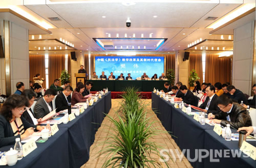 教授、民法研究室主任谭启平主持。西南政法大学党委书记樊伟,国家法官学院副院长蒋惠岭,重庆市教委高教处处长蒋后强,中国法学会副会长、中国法学会民法学研究会会长王利明先后致辞。樊伟在致辞中表示,本次会议是在全国本科教育工作会之后第一个以特定的一门课程的“金课”建设为主题的全国性研讨会。蒋惠岭在致辞中对中国《民法学》教学改革提出五点建议。王利明在致辞中就如何构建具有中国特色的民法学理论体系发表看法。