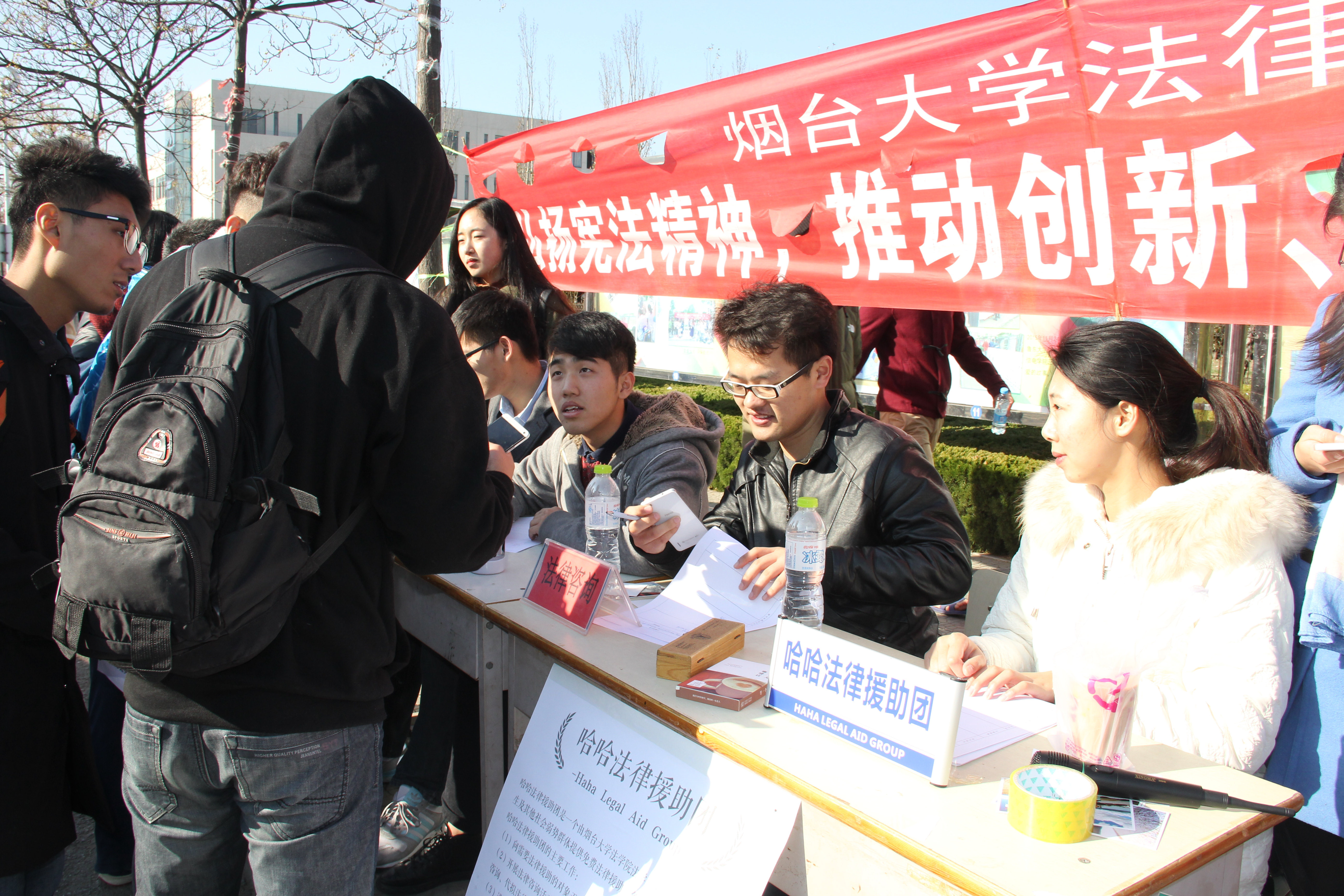 学生志愿者携带提前制作的“国家宪法日”主题宣传单、书签等物品,在七餐附近设置咨询台,进行法律咨询与普法宣传活动。志愿者一边向过路的同学发放宣传页,一边热情地为同学们提供法律咨询。当晚,91天堂