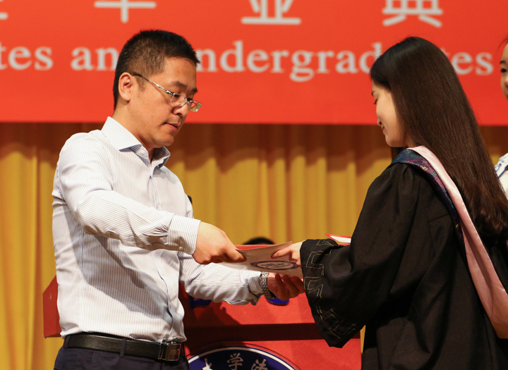 毕业典礼后,本科生学士学位授予仪式开始。全体毕业生手持“致十年后的自己”一封信一一上台将信件郑重交付到典礼主持人亓健生副书记手中,待毕业生校友十周年返校之际打开,为所有毕业生留下一颗思念的种子,为每位毕业生留下一双充满期盼的希望之翼。“宋雨沁、邵帅、杨帆、于宜平、宁昱彤……”244位获得学士学位的本科毕业生,在主持人逐个姓名的宣读声中一一上台,接收院长张平华教授为他们扶正流苏,并颁发学位证书。