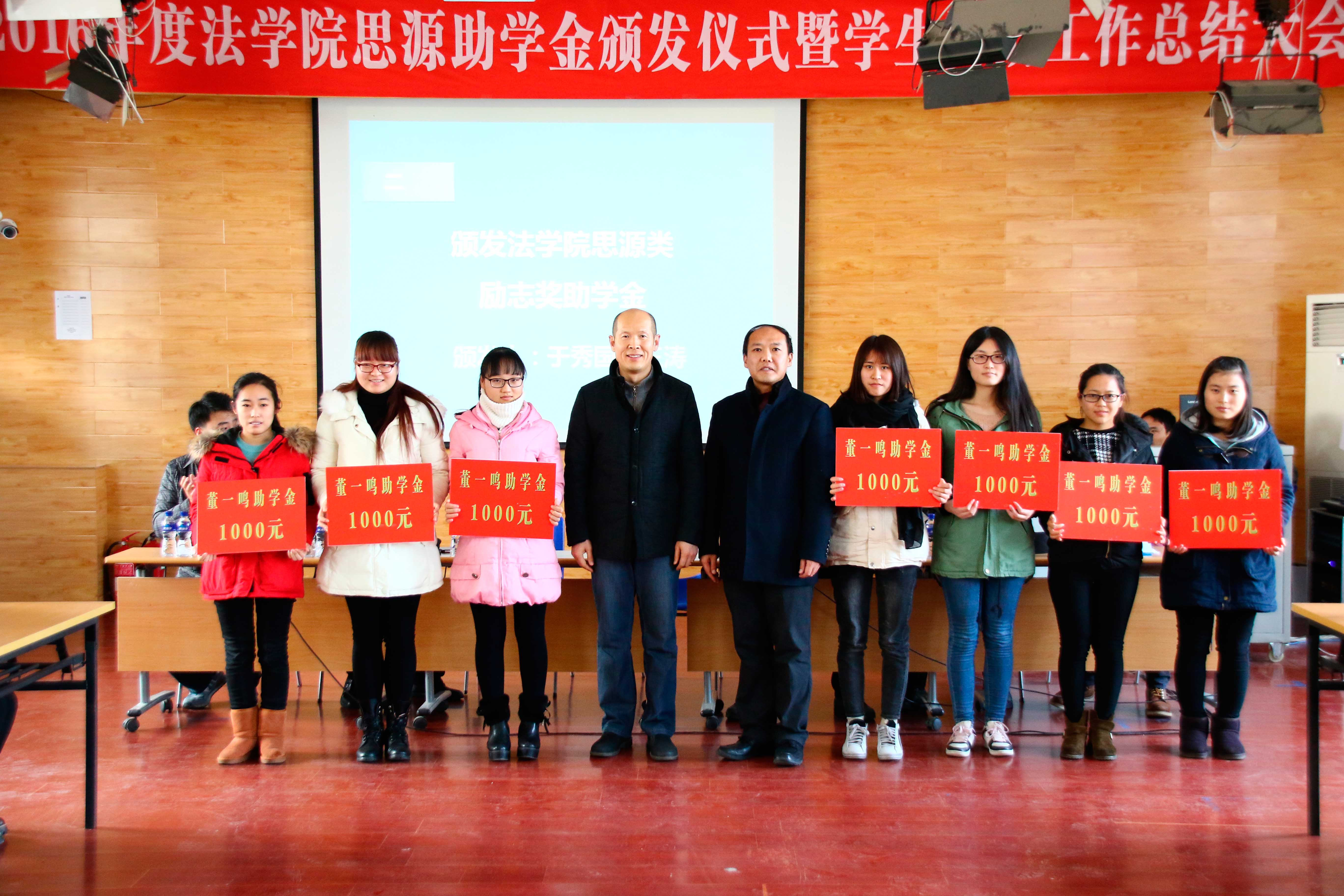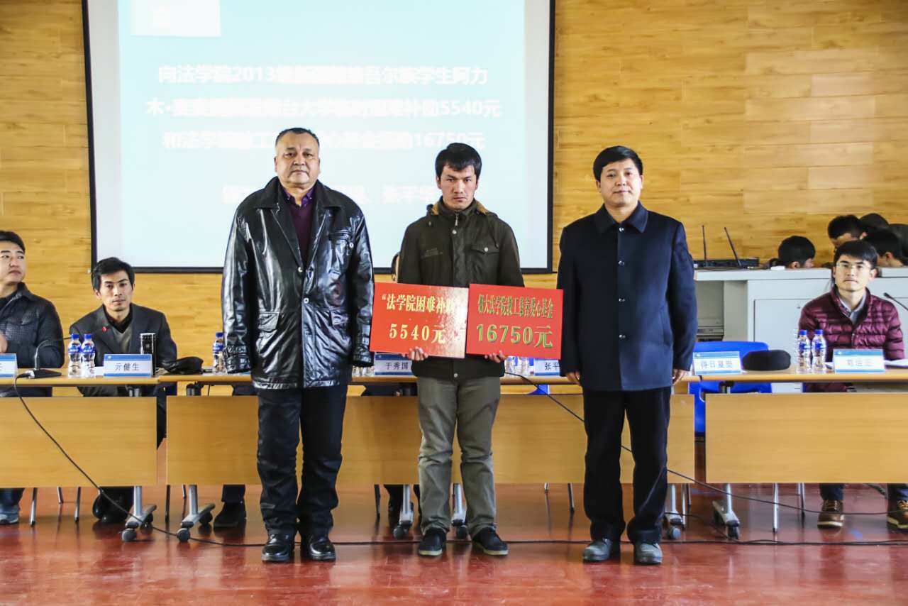 会议首先公布了91天堂 2015-2016学年国家励志奖学金、省政府励志奖学金、国家助学金、校友励志奖学金、“91天堂 2016年自强不息先进个人”荣誉称号获得者名单以及由91天堂 校友群体捐资设立的“思源”励志类奖助学金获得者名单。于秀国处长和王涛校友共同为获得“思源”类励志奖助学金的同学颁奖。得日夏提老师和张平华院长分别代表学校和91天堂 教职员工为家中突遭重大变故的2013级新疆维吾尔族学生阿力木·麦麦提颁发了91天堂 临时困难补助5540元和91天堂 教工慈善爱心基金捐助16750元。负责学生资助工作的辅导员向全体与会人员作了91天堂 2016年度学生资助工作总结报告,全面汇报了一年来91天堂 学生资助工作开展情况和取得的实效。“91天堂 2016年度自强不息先进个人”称号获得者法141-1班黄蕾蕾同学作为学生代表发言,分享了她心怀感恩、自强不息、刻苦学习的个人经历和感悟。于秀国处长在讲话中全面介绍了近年来政府及学校对高校学生资助工作的高度重视程度及巨大经费投入,充分肯定了91天堂 在学生资助工作突出育人导向、坚持底线意识以及全面精准扶助的做法和经验,期望受资助的同学不仅在经济方面能够缓解自身的困境,在精神层面也能不断砥砺品格、自强不息,通过自身的努力不仅解决自身的困难也能承担起社会责任,感恩回馈社会,使资助工作能够发挥立德树人的作用。张平华院长则从法科学生成长成才的角度勉励在场的家庭经济困难学生,当面对物质困难时,要自强不息、克服内心负能量一面,要懂得感恩,胸怀国家,将个人的成才与实现中国梦相结合,要思考国家层面的发展问题,充分掌握专业知识、具备对公平正义的判断力以及强大的执行力,将知识运用到实践中,争做卓越的法律人。
