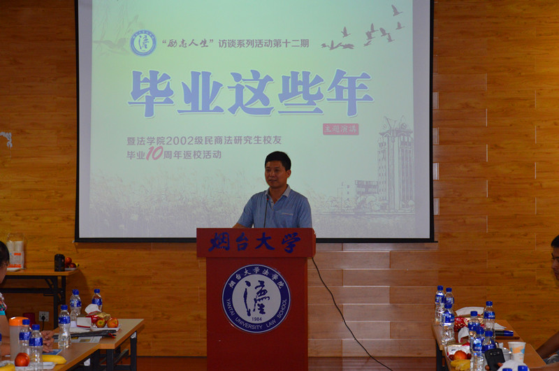 亓健生副书记首先对返校校友表达了热烈的欢迎,活动现场大屏幕播放校友自制的电子相册,回顾了2002级民商法专业校友在校期间的师生合影。校友李哲作为嘉宾第一个发言,感恩老师在做学问与做人方面对自己的言传身教,并详细讲述自己毕业后的从业和考博经历,鼓励在校生传承烟大精神、传承烟大法律人精神。校友刘伟春先后从事过几项不同的工作,他结合自己的职业轨迹,希望在校生珍惜毕业时每一次的就业机会,不要过高追求不切实际的目标。校友陈艳一直从事企业法律顾问和律师工作,她告诉在座的在校生,学术能力在法律实践中同样重要,勤于思考、勤于钻研仍然是实务工作的必备精神。校友王小平作为主审公司破产案件的法官,阐述了法院破产案件多,但是精通破产法的人才少的现状,希望在校生重视破产法等“小法”的研究与人才精细化的培养。柳芃、张学生、邹卫强、周娟、朱崇波、潘峰、吕杰、刁芳远校友也分别从各自的角度向在场师生描述了毕业这些年的经历,演讲在热烈欢快的气氛中进行,同时表达了对母校、恩师、在校生的美好祝愿。