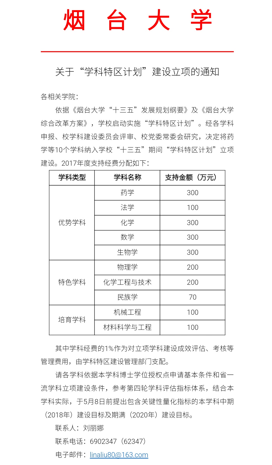 综合改革方案》启动实施了“学科特区计划”。经各学科申报、校学科建设委员会评审、校党委常委会研究,确定了学校“十三五”期间“学科特区计划”立项建设。其中“优势学科”5项,特色学科3项,培育学科2项。“十三五”期间,学校将给予优势学科1200万(理工科)/400万(文科)的经费资助。