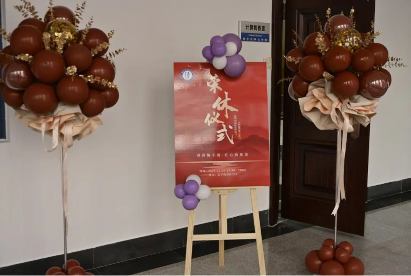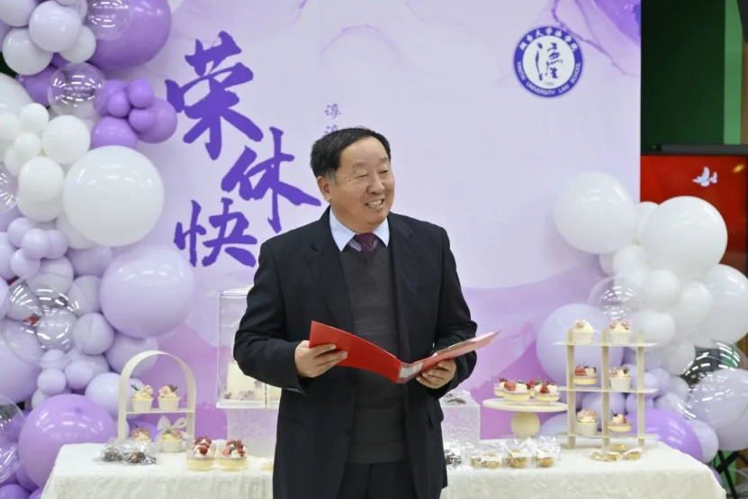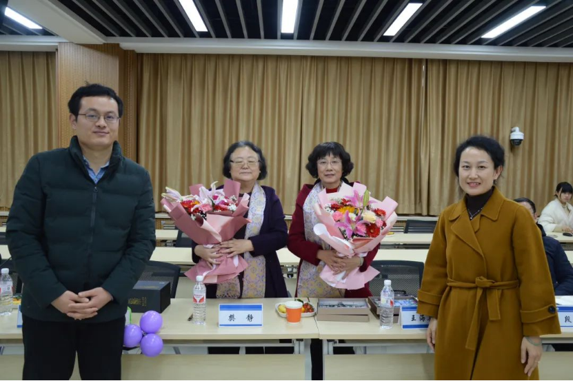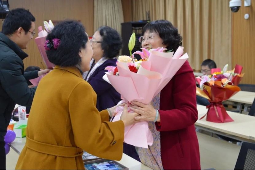 青年教师代表李冬冬、董水清分别向荣休教师献花,全体参会成员同享祝福蛋糕。