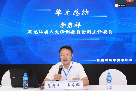 最后,由黑龙江省人大法制委员会副主任委员李启祥进行单元总结。李启祥从地方立法实务层面对文章中提出的观点做出一一回应,力求从实务角度解决实际问题。其用八个字对文章做出肯定性评价——“文辞惊鸿,真言善语”,用“新、全、准”对文章内容进行总结。借此机会对新时代立法工作格局进行了全面阐述——“党委领导、人大主导、政府依托和各方参与”,并表示这16个字是地方立法工作一个基本工作程序,必须要坚持。第一,是党委领导,在人大立法工作中,人大机关首先是政治机关,立法工作首先是政治工作,立法活动首先是政府活动。对文章中提到的“地方立法驱动力之一是响应自上而下的制度指令,基于向上的政治姿态与地方立法权实现政治目标,以立法追求自身的治理绩效”。其回应道:“在地方立法实践当中,通过一项法律,不是高票通过,而是必须要全票通过,这就是在立法过程中,集中体现党的意志的表现。在通过立法表达政策理念、治理成效的同时,地方立法也注重实效”。第二,是人大主导,李启祥指出:“人大机关不仅仅是地方立法工作的主持人,而且是地方立法工作的主角,人大主导主要体现在立项主导、立法程序主导、立法内容和立法决策的主导三个方面”。针对文章对立法语言“口语化”、“公文化”、“文学化”的批判,李启祥主任表达了不同的观点。“使用群言群语、让立法语言更接地气,才能更好地执行法律”。