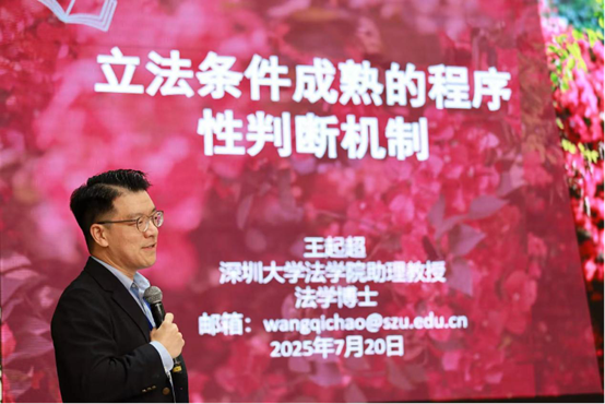 王起超助理教授从他的报告题目出发,将报告分为立法条件成熟现象、程序机制的建构、程序机制是否是最优解三部分进行讲解。在第一部分,王起超助理教授讲述他对“立法条件成熟”现象的思考在现实上来自于疫情期间立法现象的反思,在规范上来自于我国《立法法》第十四条中对授权立法事项“立法条件成熟”时,由全国人民代表大会及其常务委员会及时制定法律的规定,在学理上来自于法律案成熟度的研究、立法事实的研究、立法决策的研究等等。在第二部分,王起超助理教授从为什么必须依靠程序、依靠什么样的程序、中国立法条件成熟判断的程序建构对程序机构的建构进行讲解,从立法前评估、立法提案、立法规划、立法审议四个方面逐一进行分析。在第三部分,他从程序判断机制的运作逻辑、非常规状态立法对程序性判断机制的挑战与回应、程序如何进行价值选择即如何协调科学面向和民主面向,对程序机制是否是最优解展开分析。最后,王助理教授强调立法条件成熟作为一个具有中国特色的话语与概念,讲述了中国特色的立法理论与实践,立法条件成熟的程序性判断机制在当下的政治和法律环境中对于增进公众的立法知情权,避免立法决策的任意性具有重要意义。