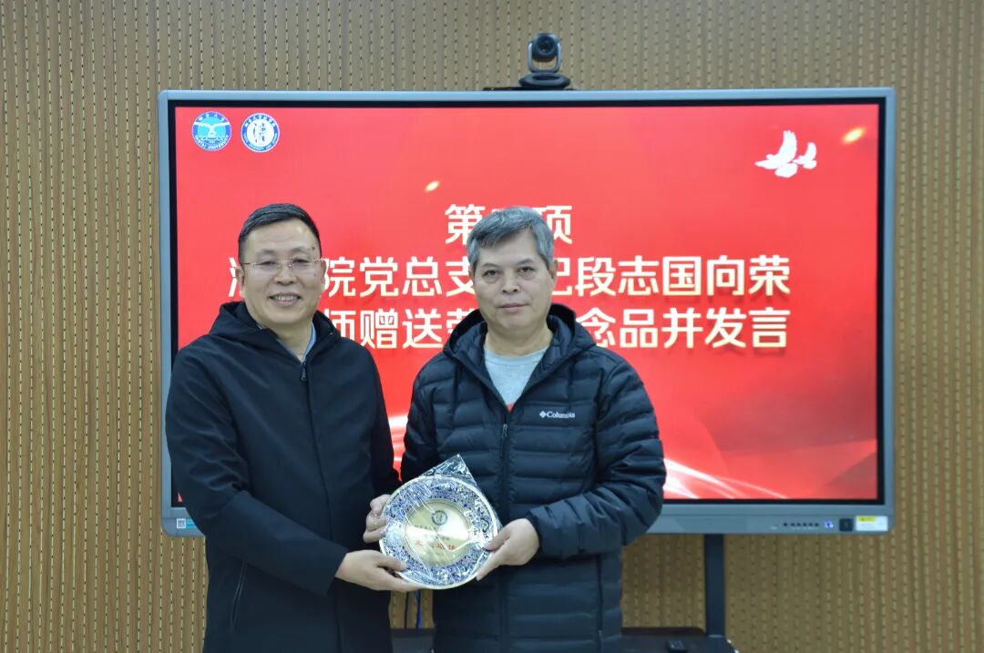 党总支书记段志国为初炳东老师颁发光荣退休纪念盘,这不仅是学院对荣休教师执教生涯的致敬,更是对深耕法学教育、培育栋梁的铭记。
