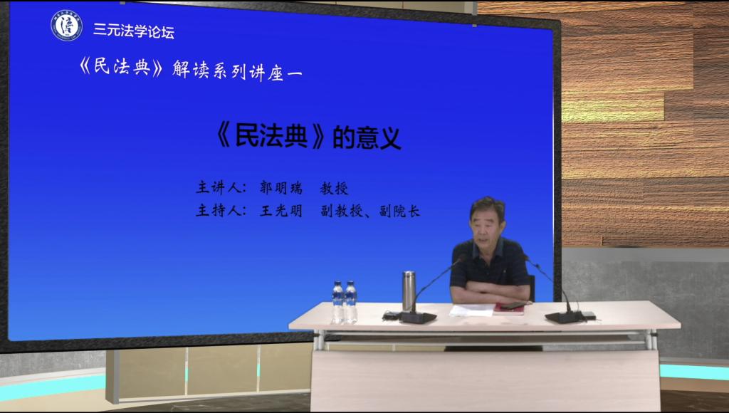 副院长王光明老师主持,通过线下线上直播的方式进行,吸引了近3000人参与讲座。郭明瑞教授结合民法典的具体规定,从五个方面对民法典的意义进行了深入的解读,第一,民法典总结了我国70年民事立法的经验教训,为国家治理现代化提供了法治基础。第二,民法典创设了新的法典体系,反映了时代特点,提供了法典的新模式,新范例。第三,民法典为调整民事关系,维护社会和经济秩序提供了基本准则。第四,民法典是适应中国特色社会主义发展的法治类型。第五,民法典为弘扬社会主义核心价值观,坚定“四个自信”提供了制度保障。