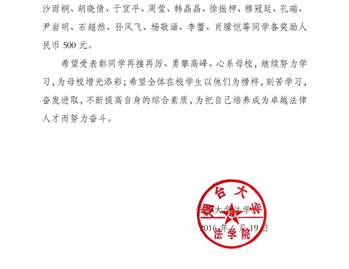 烟大91天堂 【2016】9号关于颁发2016年思源·星权职业律师奖学金的决定