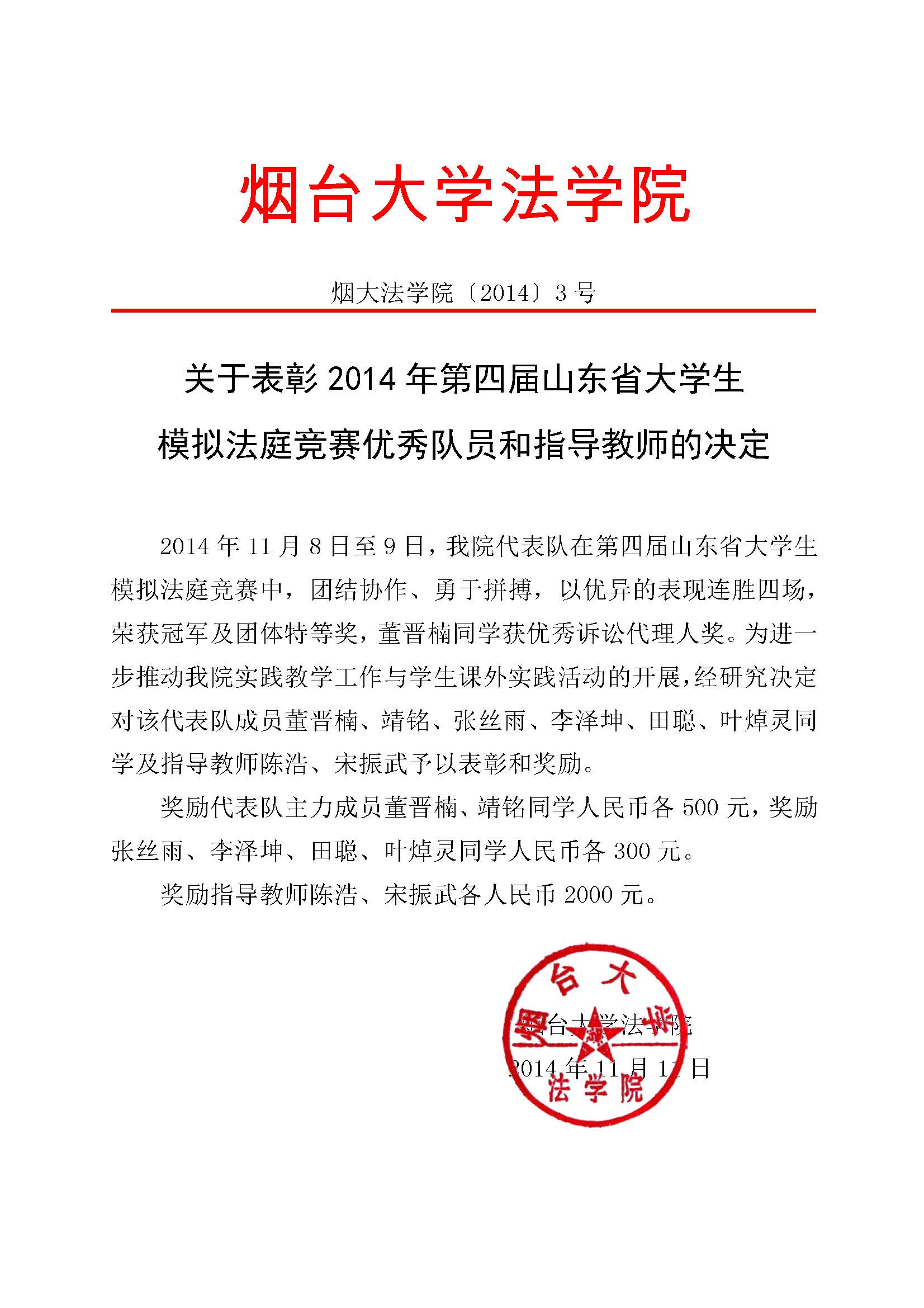 关于表彰2014年第四届山东省大学生模拟法庭竞赛优秀队员和指导教师的决定