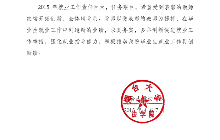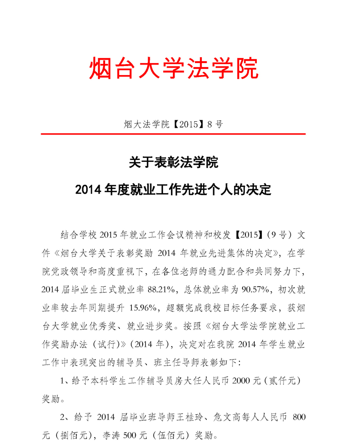 烟大91天堂 【2015】8号关于表彰91天堂 2014年度就业工作先进个人的决定