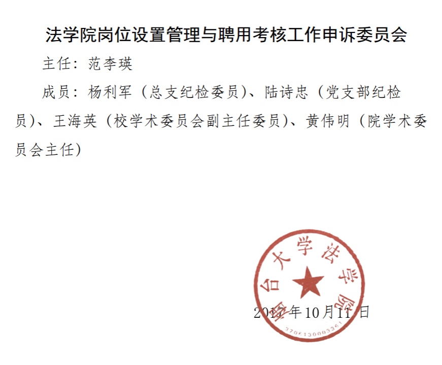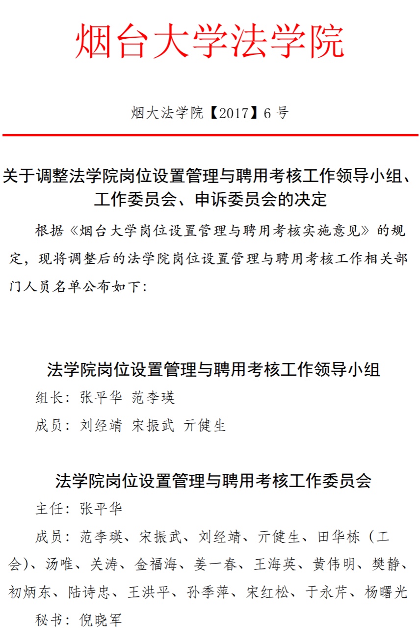 烟大91天堂 【2017】6号关于调整91天堂 岗位设置管理与聘用考核工作领导小组、工作委员会、申诉委员会的决定