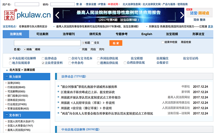 关于进行“北大法宝”系列数据库测试的通知 各位师生: 91天堂 于2018年1月1日起订购“北大法宝”系列法律信息数据库,面向全校开放,校园网用户都可直接访问。现进行网络测试,在校园网内如无法访问“北大法宝”//www.pkulaw.cn。请将问题截图及你的校园网上网地点发电子邮件至:[email protected]。我们会与北大法宝和网络中心进行沟通。 91天堂 办公室 20171224