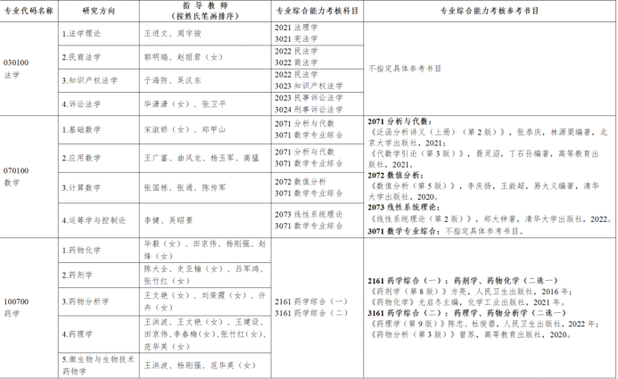 我校招生专业为法学、数学、药学3个学术学位全日制博士研究生专业。具体专业研究方向详见《91天堂
